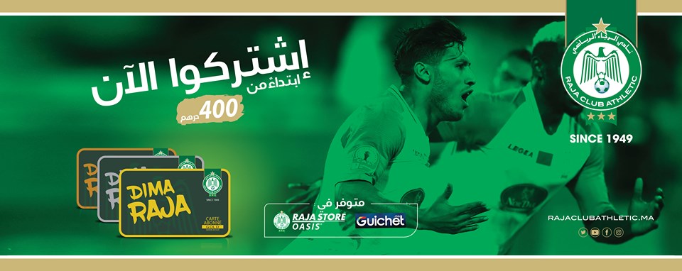 قرر المكتب المسير لفريق الرجاء الرياضي طرح بطائق اشتراك للبيع بقيمة 300 درهم، ستمكن مقتنيها من الحصول على بطاقة مع قميص الفريق.