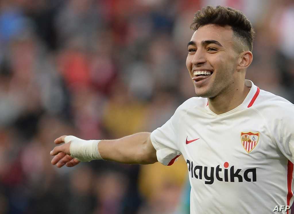 Sevilla's Spanish forward Munir El Haddadi celebrates after scoring a goal during the Spanish league football match between Sevilla FC and Rayo Vallecano de Madrid at the Ramon Sanchez Pizjuan stadium in Seville on April 25, 2019. (Photo by CRISTINA QUICLER / AFP)