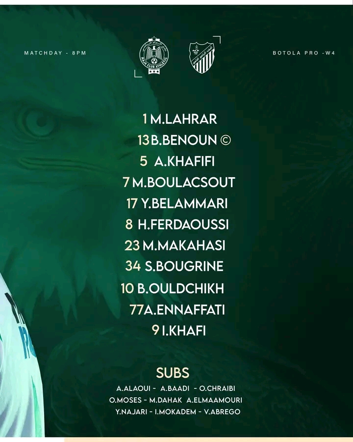 وفيما يلي التشكيلة الرسمية للرجاء الرياضي:
