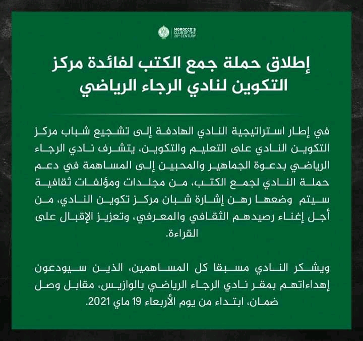 وطلب الرجاء من جماهير النادي ومحبيه وضع الكتب والمجلدات رهن إشارة النادي، من أجل وضعها في مركز تكوين الفريق، لتكون تحت تصرف اللاعبين.