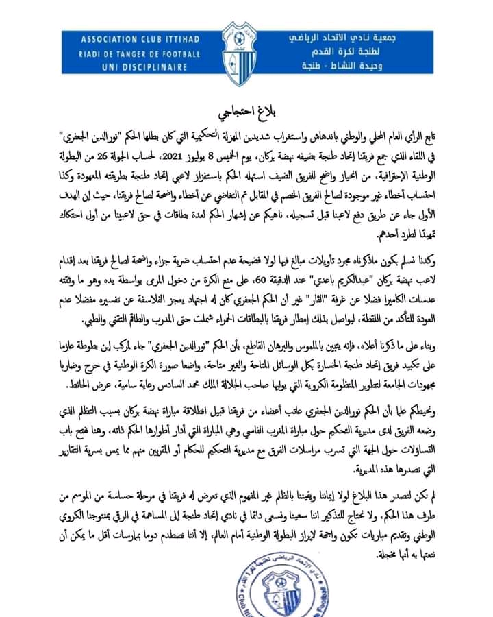 وأكد الفريق الأزرق، عبر بلاغ استنكاري، أن نور الدين الجعفري كان بطلا لمهزلة تحكيمية خلال مباراته ضد نهضة بركان يوم الخميس الماضي 08 يوليوز 2021، متهما إياه بالانحياز الواضح للفريق الضيف، من خلال استفزازه للاعبي اتحاد طنجة بطريقته المعهودة.