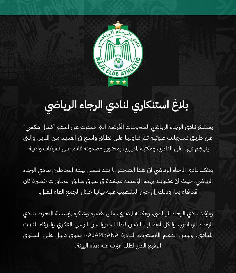ويؤكد نادي الرجاء الرياضي أن هذا الشخص لم يعد ينتمي لهيئة المنخرطين بنادي الرجاء الرياضي، حيث أن عضويته بهذه المؤسسة مجمدة في سياق سابق، لتجاوزات خطيرة كان قد قام بها، وذلك إلى حين التشطيب علیه نهائيا خلال الجمع العام المقبل.