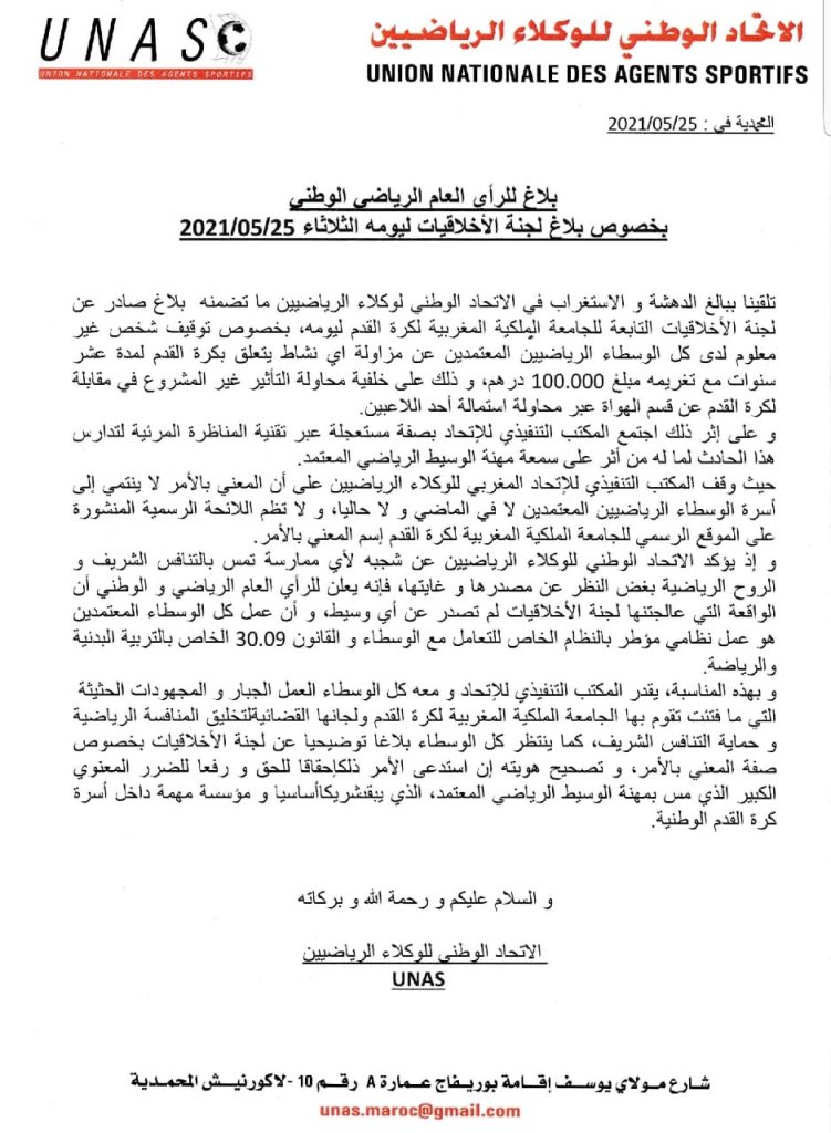 وفيما يلي بلاغ الاتحاد الوطني لوكلاء اللاعبين: