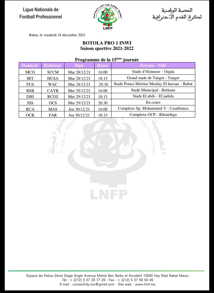 كشفت العصبة الوطنية لكرة القدم الاحترافية، اليوم الجمعة 24 دجنبر 2021، عن البرنامج الكامل للجولة الخامسة عشرة من منافسات البطولة الاحترافية في قسمها الأول.