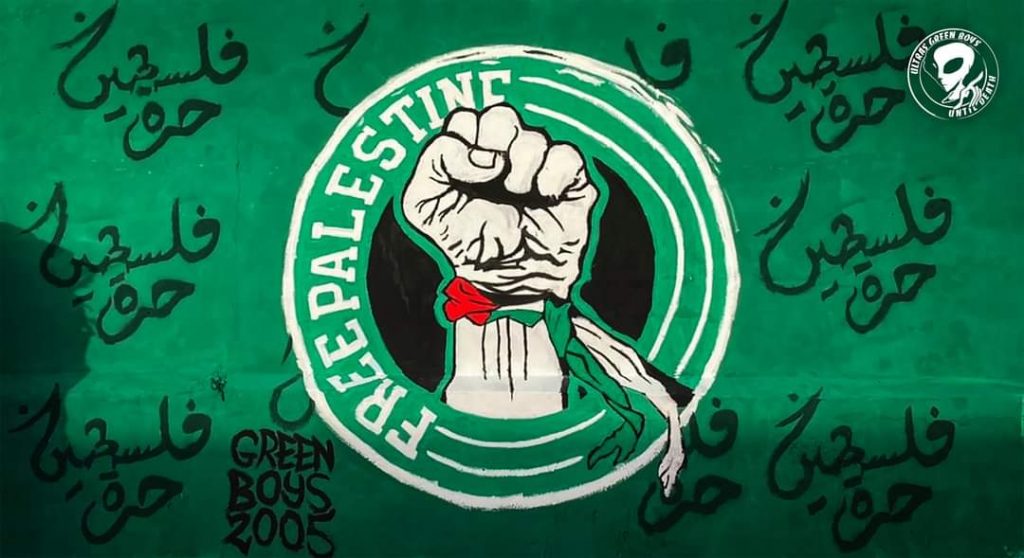 أبدعت الترات غرين بويز المساندة لفريق الرجاء الرياضي، في أشكال تضامنها مع الشعب الفلسطيني في محنته التي يعيشها والإرهاب الذي يتعرض له من قبل العدو الصهيوني، أمام مرأى ومسمع من العالم كله.