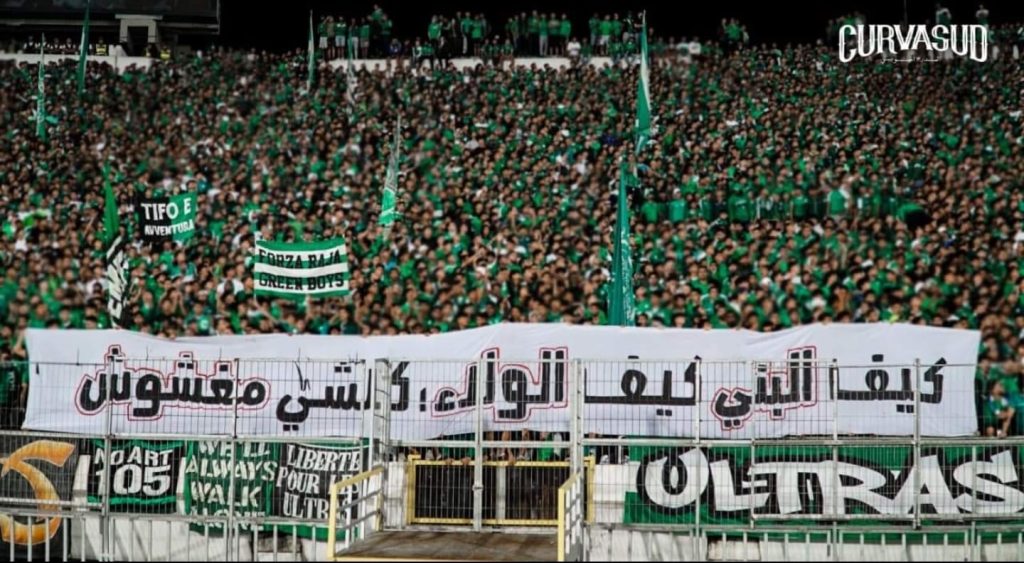 وكانت جماهير الرجاء قد رفعت لافتة في مباراة الفريق ضد حسنية أكادير، تتضمن “كيف البناء كيف الولاء كلشي مغشوش”.