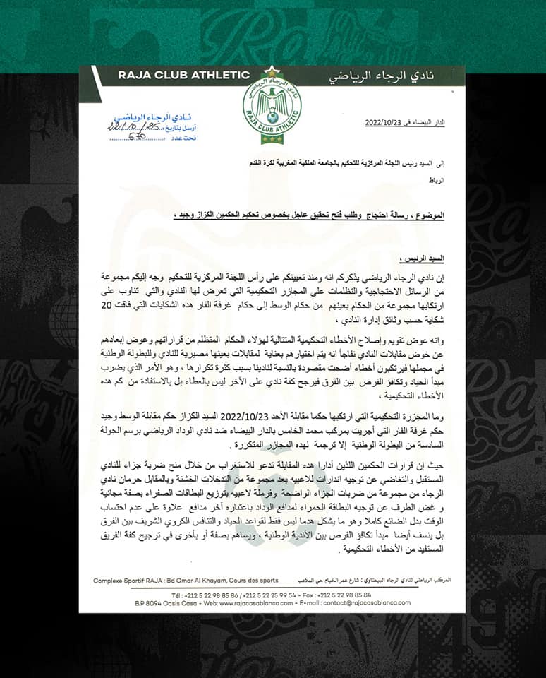 نشرت الصفحة الرسمية لفريق الرجاء الرياضي الرسالة الرسمية التي بعث بها الفريق إلى المديرية الوطنية للتحكيم من أجل الاحتجاج على الحكمين سمير الكزاز، ورضوان جيد، بعد قيادتهما لمباراة الديربي أمام الوداد الرياضي، أول أمس الأحد 23 أكتوبر 2022، برسم مؤجل الجولة 6 من الدوري الاحترافي.