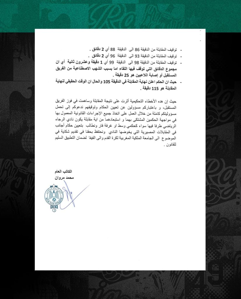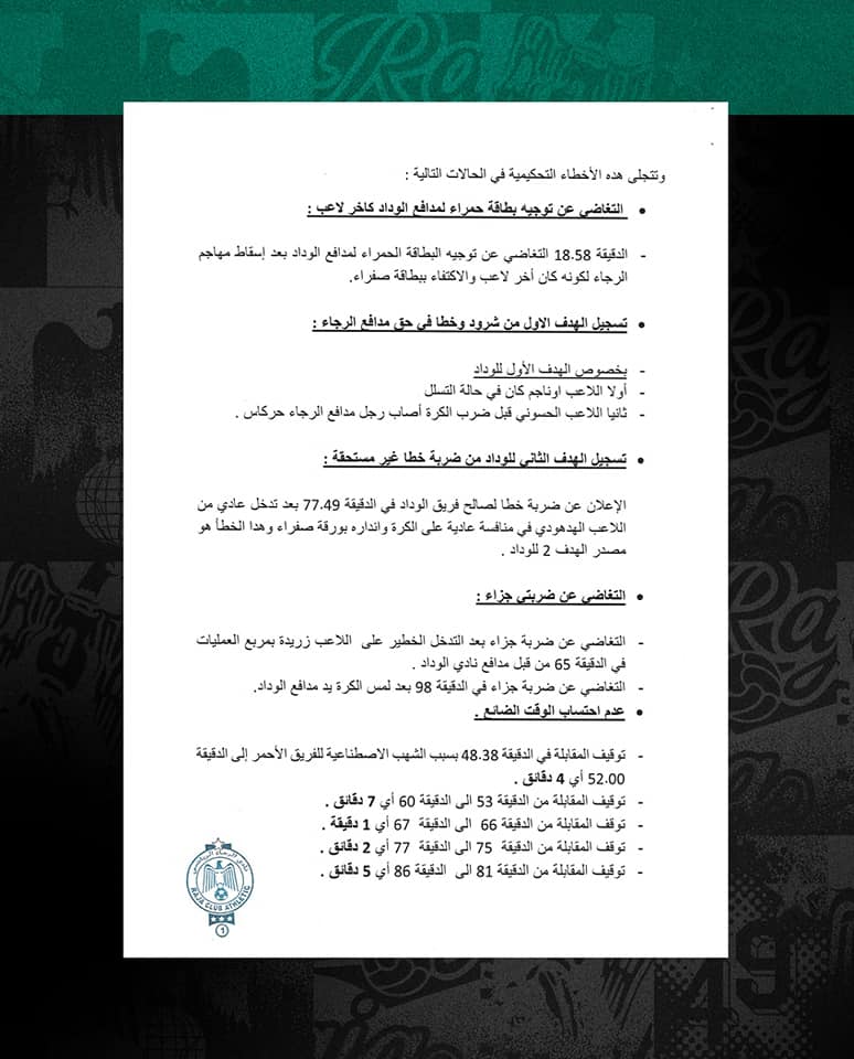 واتهم الرجاء في رسالته الحكمين بارتكابهما لمجاز تحكيمية في حق الفريق الأخضر، مؤكدا أن الأخطاء استفاد منهم الوداد الرياضي، للفوز في الديربي.