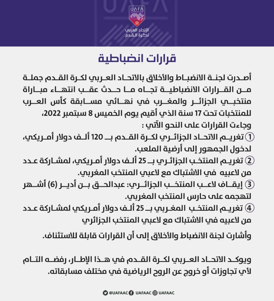 أصدر الاتحاد العربي لكرة القدم 3 عقوبات في حق الاتحاد الجزائري والمنتخب الجزائري لأقل من 17 سنة، ولاعب بالمنتخب المذكور، بعد أحداث الاعتداءات التي شهدها نهائي البطولة العربية بين المنتخبين المغربي والجزائري.