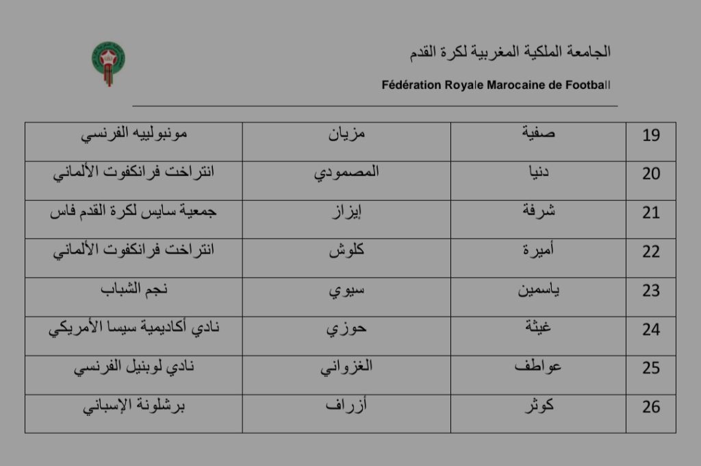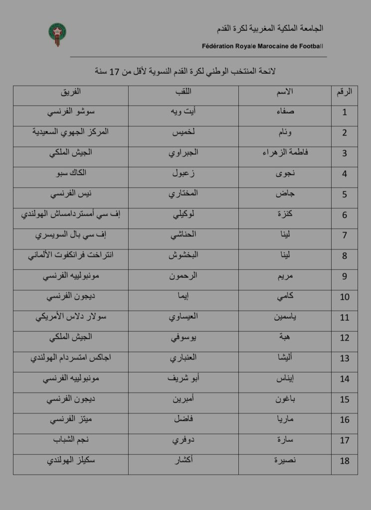 ووجه ربيع يونس، مدرب المنتخب الوطني لكرة القدم النسوية لأقل من 17 سنة الدعوة إلى 26 لاعبة من أجل المشاركة في هذا التجمع الاعدادي وجاءت أسماءهن كالتالي: