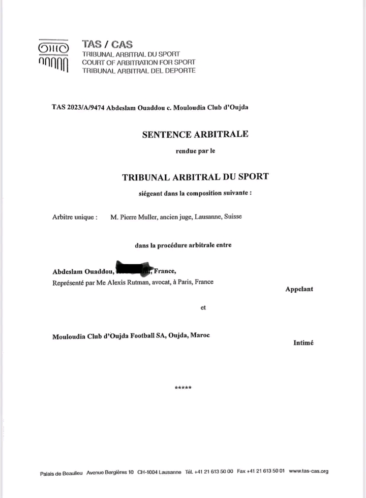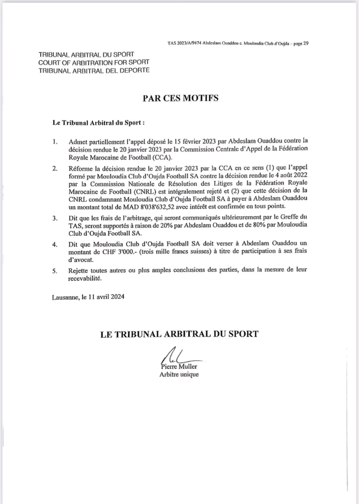 وثيقة.. “طاس” تصدم مولودية وجدة وتحكم بمبلغ مالي كبير لصالح وادو