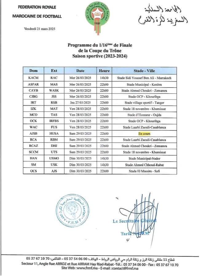 كشفت لجنة المسابقات بالجامعة الملكية المغربية لكرة القدم، عن البرنامج الكامل لمباريات دور سدس عشر نهائي من مسابقة كأس العرش برسم الموسم الرياضي 2023-2024.