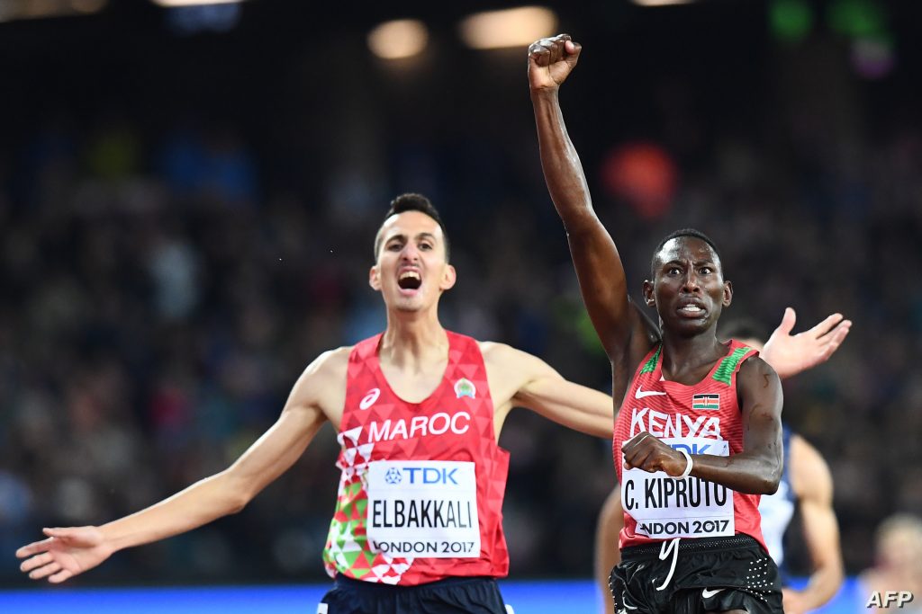 Kenya's Conseslus Kipruto (R) celebrates as he beats Morocco's Soufiane Elbakkali (L) to the finish in the final of the men's 3,000m steeplechase athletics event at the 2017 IAAF World Championships at the London Stadium in London on August 8, 2017. / AFP PHOTO / Jewel SAMAD