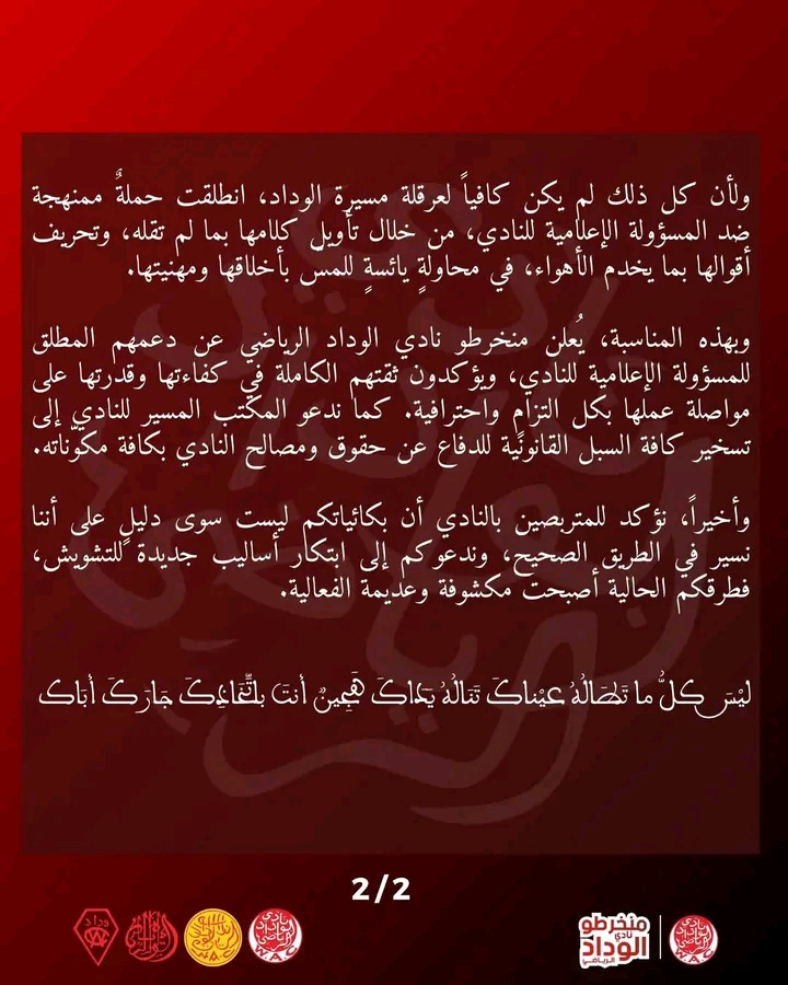 أصدر منخرطو فريق الوداد الرياضي، اليوم الثلاثاء 11 نونبر 2025، بلاغا استنكاريا وتضمانيا، وذلك ردا على منخرطي الرجاء الرياضي.