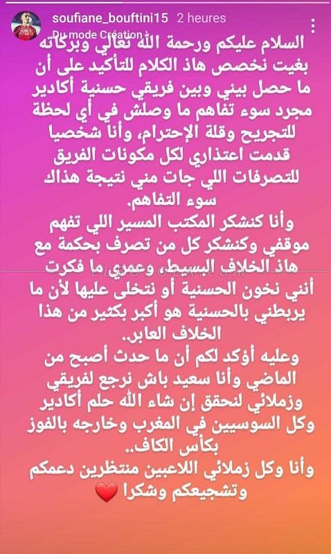 ونشر المدافع السوسي رسالة عبر تقنية السطوري على أنستغرام ” يوضح فيها ان ما وقع بينه وبين مكتب فريق حسنية أكادير هو مجرد سوء تفاهم .
