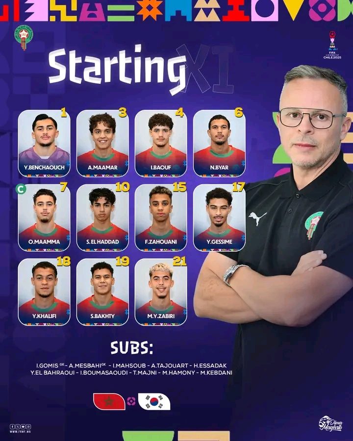 أعلن الناخب الوطني محمد وهبي، مدرب المنتخب المغربي لأقل من 20 سنة، عن التشكيلة الرسمية التي ستخوض مباراة ثمن نهائي كأس العالم لأقل من 20 سنة أمام منتخب كوريا الجنوبية، مساء اليوم الخميس 9 أكتوبر 2025، على أرضية ملعب إستاديو إل تينيينتي بمدينة رانكاغوا في الشيلي.