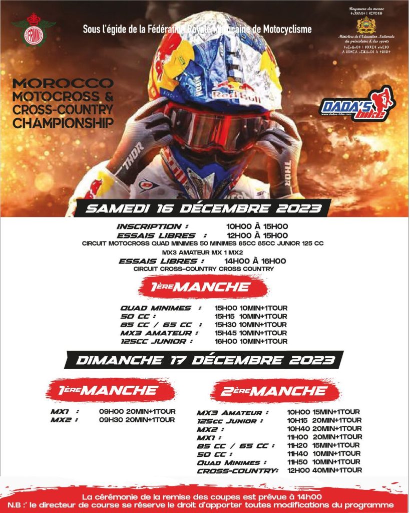 وتقام هذه التظاهرة الوطنية الكبرى التي ينظمها نادي داداز بايك للدراجات النارية، يومي السبت والاحد 16 و 17 دجنبر 2023، في تخصصي الموطوكروس والكروس كونتري، وهي الجولة الثانية من الموطوكروس و الاولى من الكروس كونتري لبداية الموسم الرياضي الخاص بالتظاهرات والمنافسات الرياضية الخاصة بالدراجات النارية وعالم السرعة للبطولة الوطنية