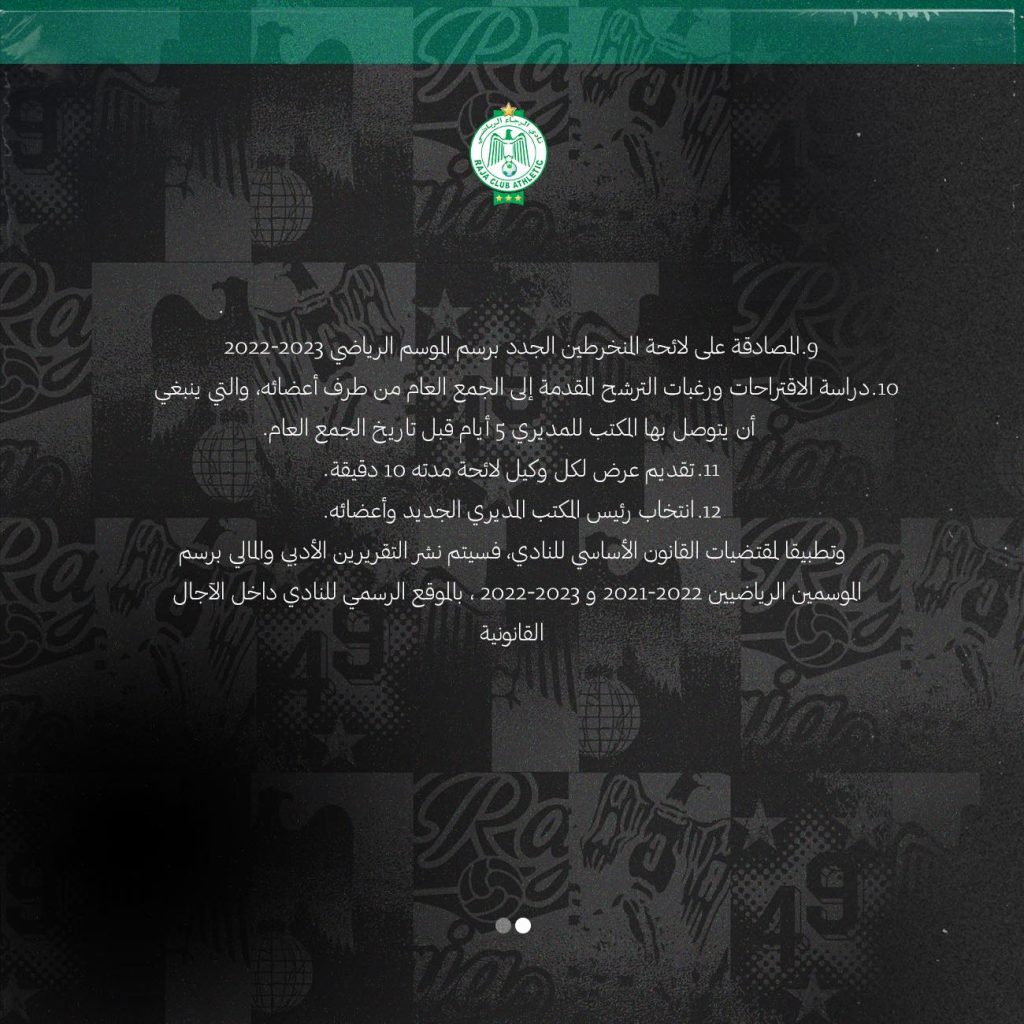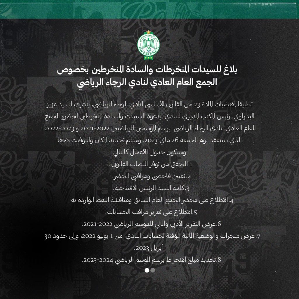 وحدد فريق الرجاء الرياضي، جدول أعمال الجمع العام في 12 نقطة جاءت على النحو التالي: