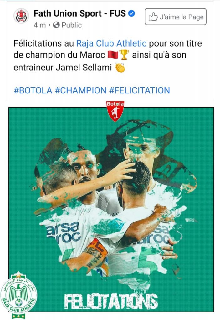 ونشر فريق الفتح الرياضي تدوينة عبر صفحته الرسمية على موقع التواصل الإجتماعي “فايسبوك” تتضمن صورة للاعبي الرجاء مع عبارات التهنئة للفريق الاخضر و كذلك لمدربه جمال السلامي عقب التتويج بدرع الدوري .