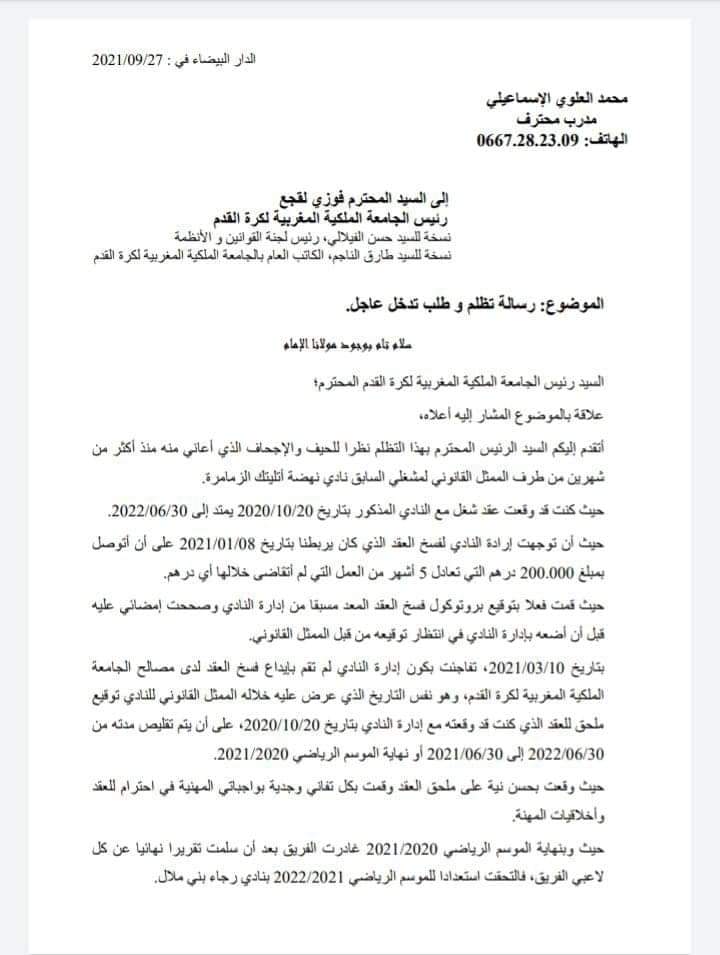 وأضاف “إن امتناع الممثل القانوني لمشغلي السابق عن استكمال مسطرة وضع ملحق العقد لدى المصلحة المختصة أضر بمصالحي وبمصالح مشغلي الحالي الذي لا يزال محروما من خدماتي كمدرب فريق رغم التعاقد القانوني من تاريخ 2021/08/27”.