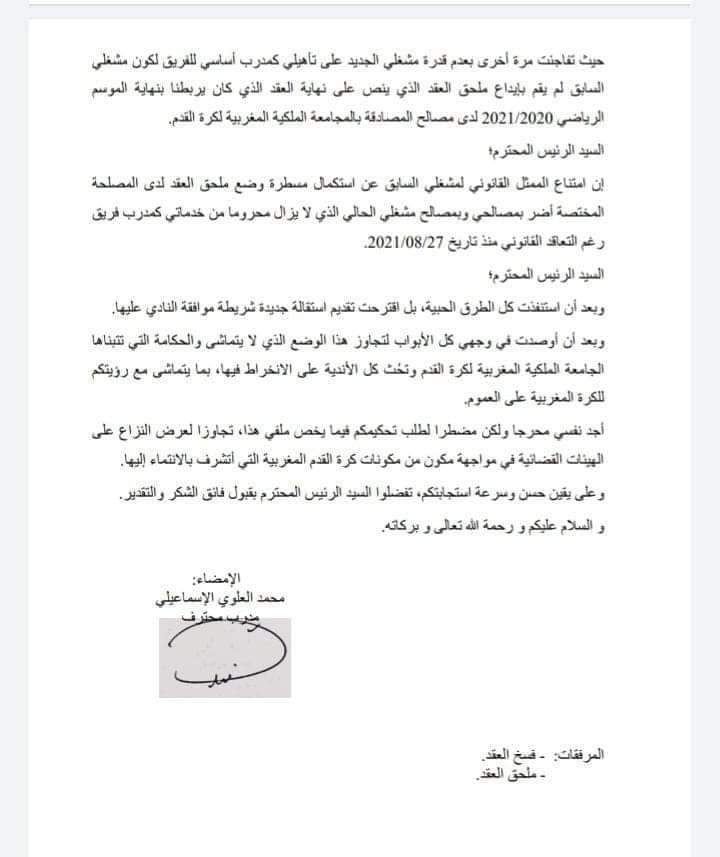 وقال العلوي الإسماعيلي في الرسالة التي وجهها للجمعة الملكية المغربية لكرة القدم، والتي توصل موقع sport1.ma بنسخة منها، ” تفاجئت مرة أخرى بعدم قدرة مشغلي الجديد على تأهيلي كمدرب أساسي للفريق لكون مشغلي السابق لم يقم بإيداع ملحق العقد الذي ينص على نهاية العقد الذي كان يربطنا بنهاية الموسم الرياضي 2021/2020 لدى مصالح المصادقة بالمجامعة الملكية المغربية لكرة القدم”.