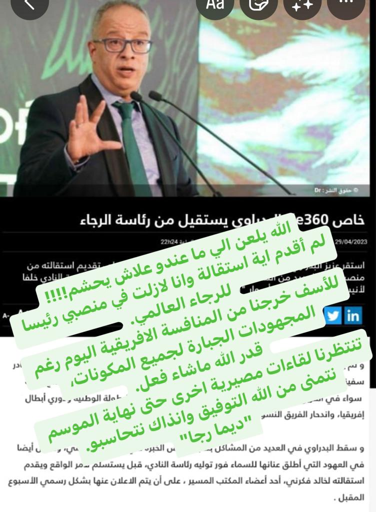 أضاف الرئيس الرجاوي أن الإقصاء كان مؤلما لكنه ليس إلى الحد الذي يدفعه إلى تقديم استقالته لزعزية استقرار النادي قبل نهاية الموسم الرياضي الحالي.