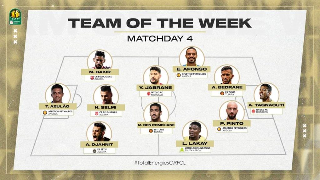 كشف الاتحاد الإفريقي لكرة القدم عبر صفحاته الرسمية بمواقع التواصل الاجتماعي،اليوم الإثنين 14 مارس 2022، عن التشكيلة المثالية لمباريات الجولة الرابعة من دور المجموعات لمسابقة دوري أبطال إفريقيا.