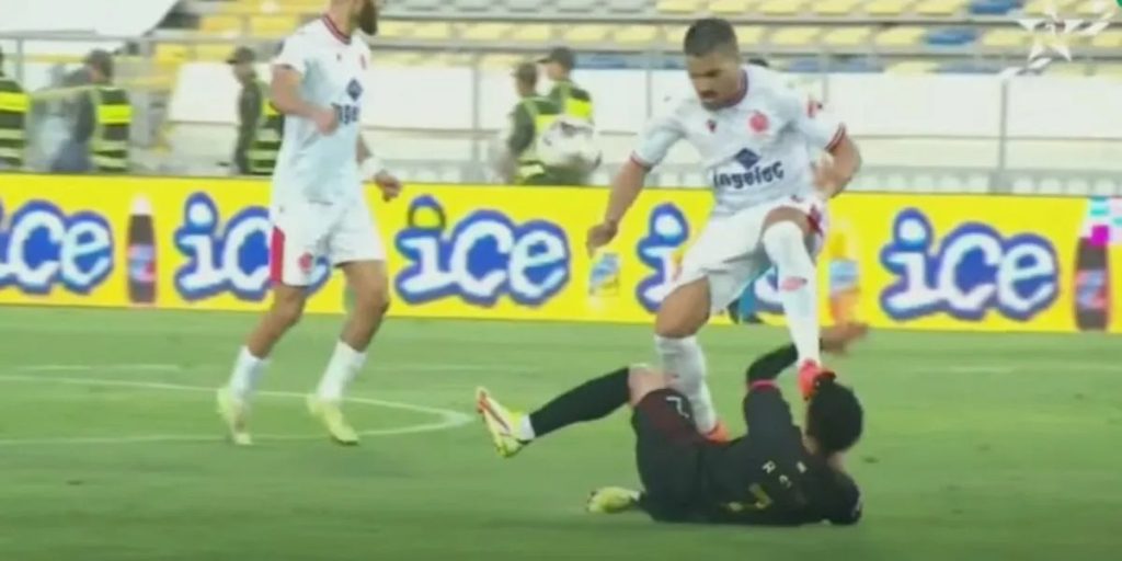 وأوضح لحرش: “نلاحظ أن لاعب الوداد البيضاوي قام بحركة إضافية بمد رجله على مستوى وجه لاعب الجيش الملكي، مستعملا أسفل حذاءه حيث قام بالضغط على وجه الخصم”.
