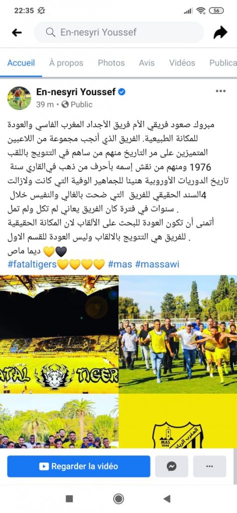 ونشر مهاجم إشبيلية الإسباني تدوينة عبر حسابه على مواقع التواصل الاجتماعي وقال” مبروك صعود فريقي الأم فريق الأجداد المغرب الفاسي والعودة للمكانة الطبيعية”.