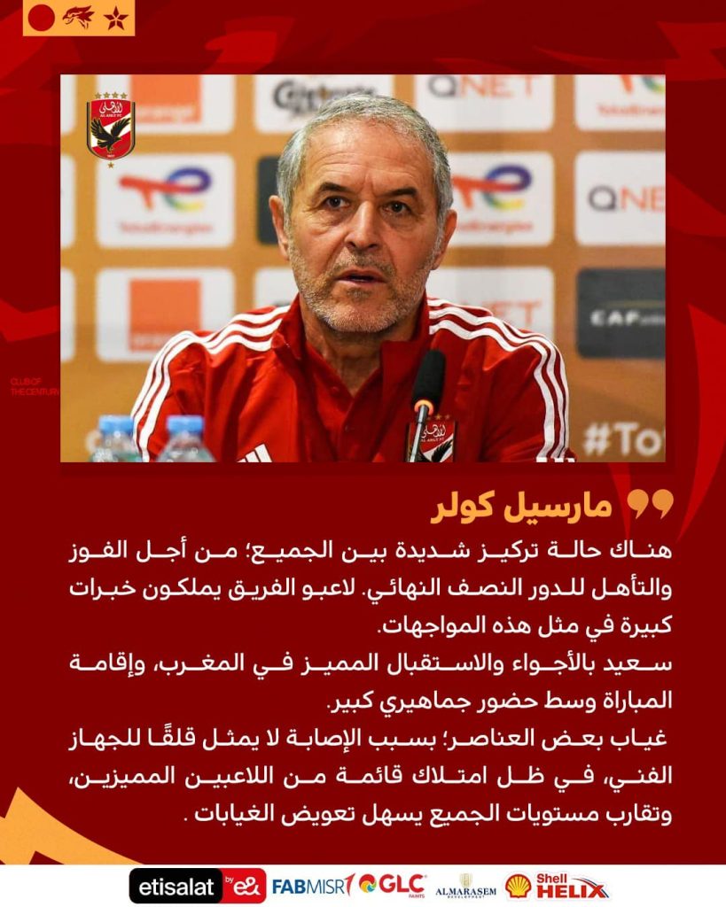 أكد مارسيل كولر مدرب فريق الأهلي المصري، أنه يتأسف للغيابات التي يعاني منها فريقه خلال مواجهة الرجاء الرياضي، لحساب إياب ربع نهائي دوري أبطال إفريقيا.
