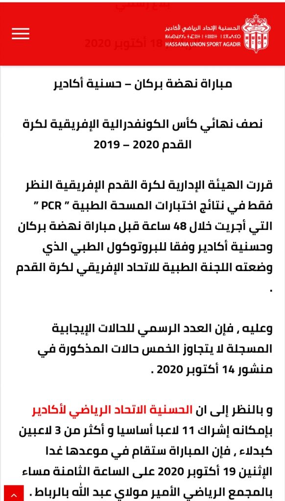 قرر الإتحاد الإفريقي لكرة القدم (كاف) إجراء المباراة بين حسنية أكادير ونهضة بركان برسم دور نصف نهائي كأس الكونفدرالية الإفريقية في وقتها المحدد.