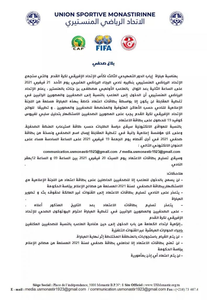 سمح فريق المنستيري التونسي بحضور وسائل الإعلام لقمته أمام الرجاء الرياضي، برسم إياب الدور المؤهل لدور مجموعات كأس الاتحاد الإفريقي لكرة القدم.