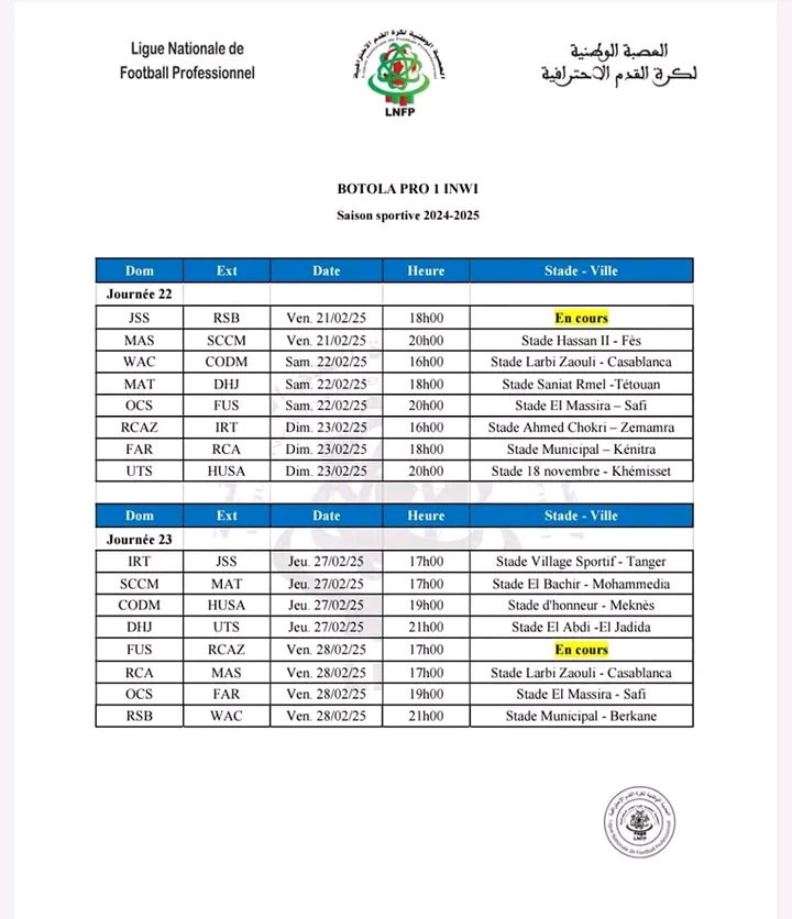 وتجرى مباريات الجولة الثانية والعشرين أيام الجمعة والسبت والأحد 21 و22 و23 فبراير 2025، وذلك بمختلف الملاعب الوطنية.