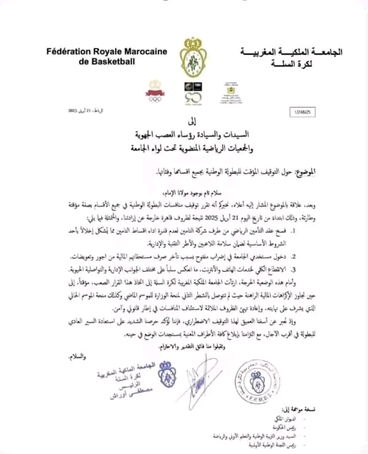 أصدرت لجامعة الملكية المغربية لكرة السلة، اليوم الاثنين 21 أبريل 2025، بلاغا تعلن فيه توقيف منافسات البطولة الوطنية في جميع أقسامها وفئاتها بصفة مؤقتة وطارئة.